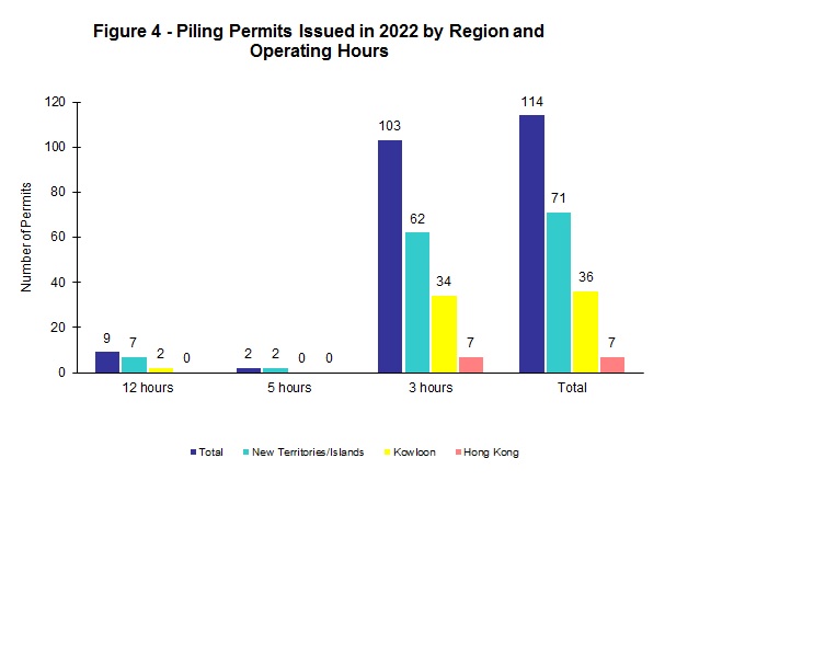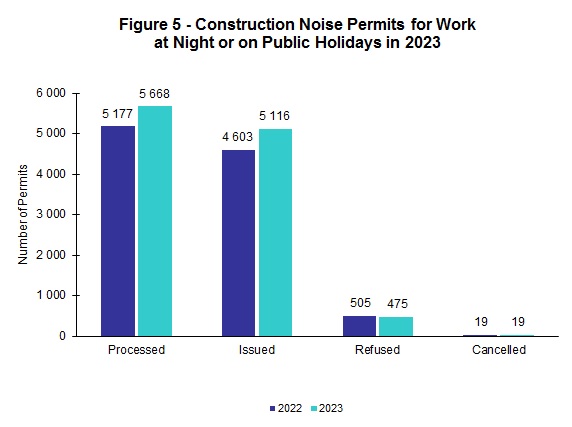 Controls on Construction, Industrial and Commercial Noise Statutory controls on construction noise under the Noise Control Ordinance and the relevant permit systems for different operations are summarised in Table 1. The number of permits issued for different operations, the number of applications processed and refused, and the number of permits cancelled in 2023 are showed in Figures 4 to 6. Hand-held percussive breakers and air compressors are controlled by a label system and the relevant application information are shown in Figure 7. |