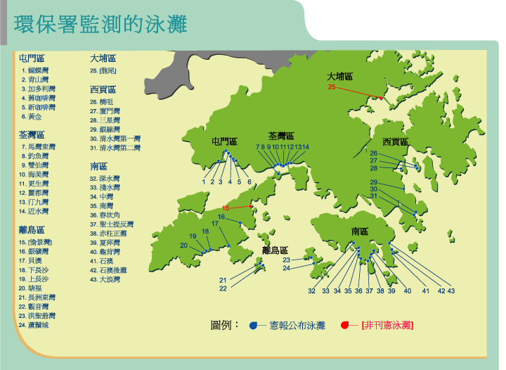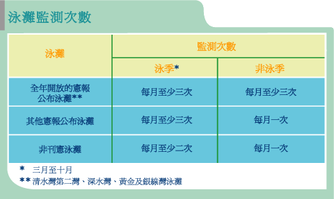 環保署自1986年執行泳灘水質監測工作後,增加了監測的頻率。在此之前,憲報公布泳灘在泳季期間每兩星期抽取水樣本監測一次,非憲報公布泳灘則每月監測一次。本署接管工作以來,多次調整了監測次數,目前每年泳季期間憲報公布泳灘每月最少進行三次水質監測,假如水質突然惡化,監測密度更會相應增加。 整年泳灘水質監測的密度乃視乎季節和個別泳灘的狀況而定。本港有多個熱門泳灘全年均開放予公眾使用,包括清水灣第二灣、深水灣、黃金泳灘及銀線灣。環保署全年每月最少在這些泳灘抽取水樣本三次進行監測,至於其他憲報公布泳灘大部份只於3月至10月泳季期間開放(個別泳灘每年4月才開放,有些泳灘則於11月才關閉)。每逢泳季,環保署每月最少在各泳灘抽取水樣本三次,非泳季則減為每月一次。兩個非憲報公布泳灘在泳季內每月抽取水樣本兩次,非泳季減為每月一次。 |