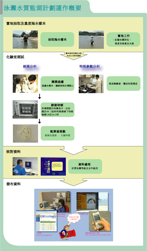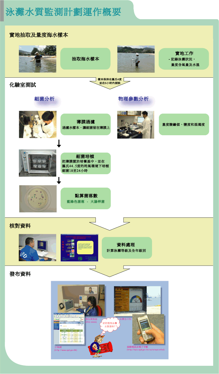 1987年,環保署自設環境微生物學化驗室,負責分析收集所得的泳灘海水樣本,棄用以往的「多管法」,改用經過改良的薄膜過濾法(Membrane