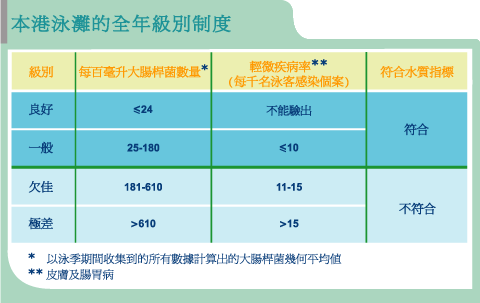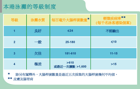 泳灘等級制可為泳客提供各泳灘在年內任何時間的最新水質資料,與全年級別制相輔相成。個別泳灘的等級是根據最近5次抽取水樣本的大腸桿菌幾何平均值而評定,由於大部份憲報公布泳灘每月均會抽取樣本三次或以上,公眾只需參考泳灘的等級,便可大概了解該月的水質狀況。