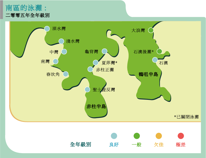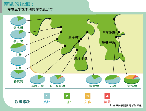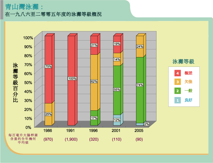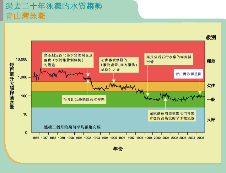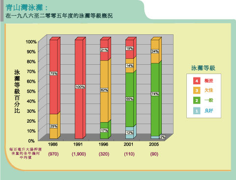 回想1986年,南區多個泳灘,包括灘頭廣闊、平靜安全的淺水灣,以至空曠的滑浪勝地大浪灣等,水質情況都不太理想,而隨 政府首先制定及實施污染管制法例,以改善水質,並立例禁止在市區內飼養禽畜,赤柱的豬場因而關閉。環保署同時亦開展雨水渠截流和改道計劃,避免污水流入泳灘。此外並採取其他措施有效地減少了排水渠和水道的污染。大部份泳灘的防污「急救」工程均在1988年至1989年間完成,此後泳灘的水質有了顯著改善。 自1989年開始,南區只有1個泳灘不符合水質指標,其餘全部達標,而且泳灘的水質均繼續改善。1990年代,政府在南區泳灘持續推行改善措施,其中在深水灣、壽臣山和淺水灣一帶的污水收集設施在1991至1995年間相繼落成。而白沙灣則於1995年中建設了全新的污水處理廠,並將處理過的污水排到雙四門水域,使赤柱一帶的泳灘水質大為改善。接 儘管南區泳灘的水質在1990年代後期已普遍改善,但石澳後灘的水質仍然欠佳,主要是因為附近還有許多村屋尚未接駁到公共污水系統,其後政府進行了排水系統改善工程將污水排放口改道至遠離泳灘的地方,石澳後灘終於在1999年達到水質指標,自此更一直沒有出現超出指標的情況。 |