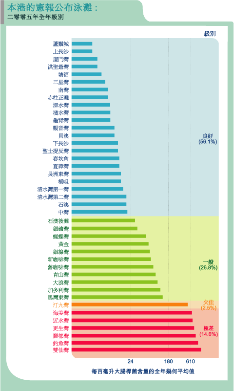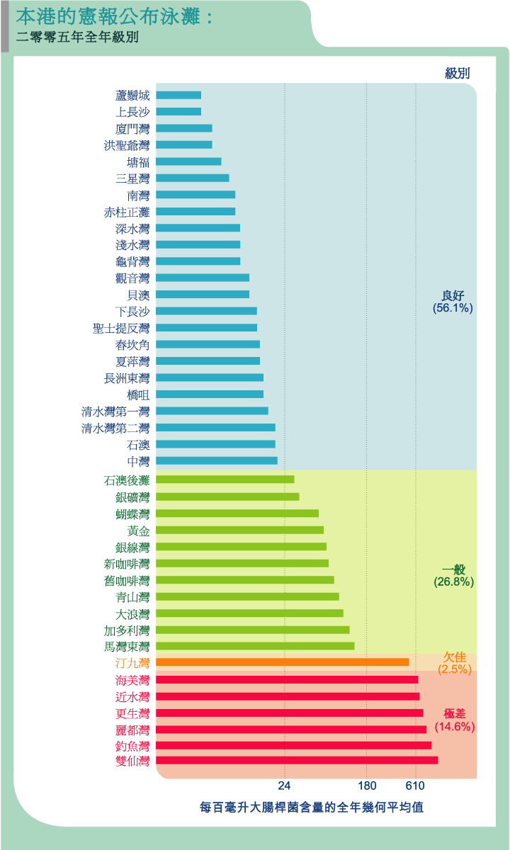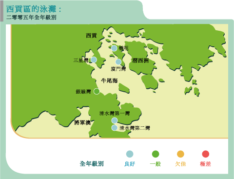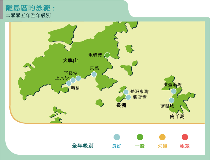 香港沿岸有許多非憲報公布泳灘,2005年環保署對其中兩個進行監測 ─ 位於大嶼山的愉景灣和吐露港北面大埔以東的龍尾。風光秀麗的愉景灣位於愉景灣住宅發展項目範圍內,是頗受泳客歡迎的泳灘,2005年全年級別為「良好」。龍尾的情況則不同,這個泳灘仍在構建中,政府計劃將原有的石灘改建為人工沙灘,以配合附近大尾篤的熱門康樂設施。2005年,龍尾的水質全年級別為「一般」,與2004年相同。 |
