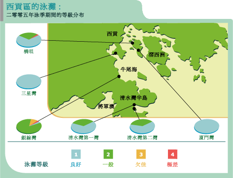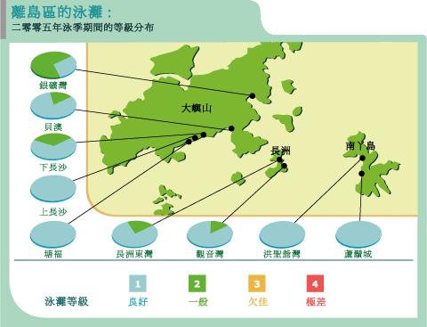 2005年,離島區9個泳灘中8個全年級別為「良好」。等級方面,4個泳灘於整個泳季維持「第一級」(良好)等級,而並無任何泳灘曾評為「第三級」及「第四級」。 銀礦灣2005年的全年級別為「一般」,雖略遜於區內其他泳灘,但其水質改善的趨勢確令人鼓舞。政府現已 |