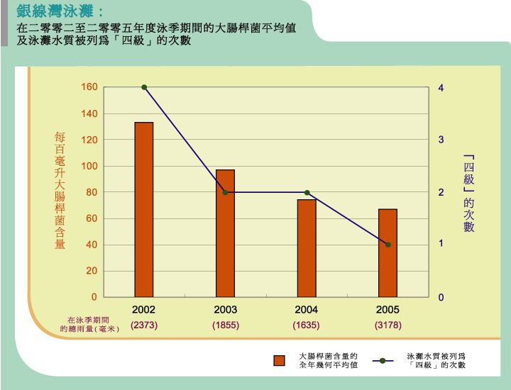 總括來說,環保署20年來悉力改善香港泳灘的水質,今天已取得顯著的成果,特別是與本署成立初期的水質比較,更是值得欣慰。本港41個憲報公布的泳灘中,34個(83%)達到水質指標,2005年全年級別為「良好」(23個)或「一般」(11個),這些泳灘分佈於南區、西貢區、離島區和屯門區。不符合水質指標的泳灘共7個,全部位於荃灣區,其中1個全年級別為「欠佳」,其餘6個為「極差」,政府正進一步採取有效的措施改善水質。本報告刊載的2005年圖表顯示「泳灘監測計劃」多年來的成效,政府將與公眾一起攜手合作進一步改善香港的泳灘,創造更美好的海濱環境,造福廣大市民和後代。 |