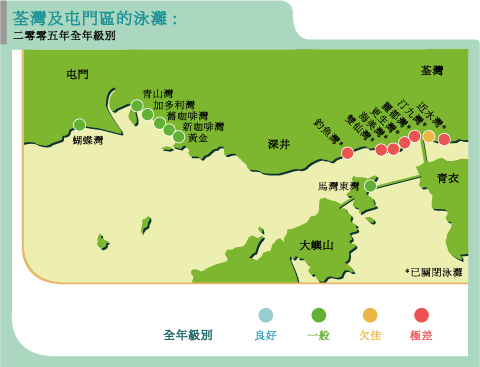 2005年,荃灣區8個泳灘中有7個未能達到水質指標。一如2004年,這些泳灘繼續關閉。此外,年內甚高的雨量對荃灣區泳灘水質亦有所影響,其中已關閉的4個泳灘的全年級別由「欠佳」下降至「極差」。全區唯一開放的泳灘是位於珀麗灣的馬灣東灣,全年級別為「一般」,泳季內一直開放供公眾使用。該泳灘在大雨期間曾被評為「第四級」,但總體來說水質遠勝於區內其他泳灘,相信這是與其地理位置有關。 |