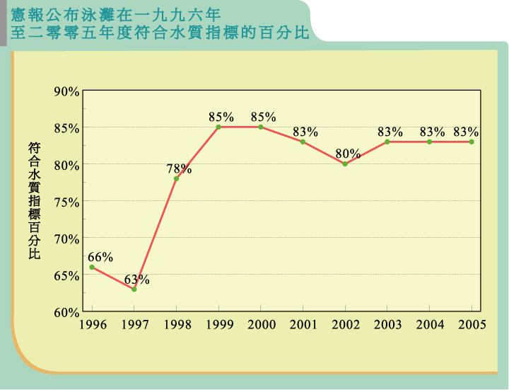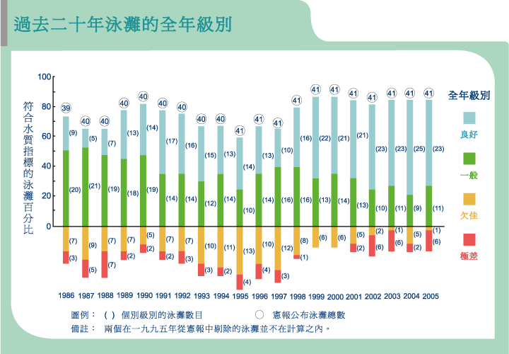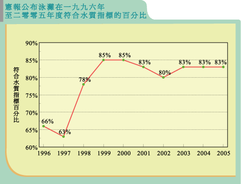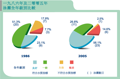 由統計數字可見,環保署過去20年在多方面取得滿意成效。繼1990年代中期泳灘級別普遍大幅下降後,本港泳灘符合水質指標的百分率錄得顯著增長,從1986年的74% (39個泳灘中有29個達標)提高至2005年的83% (41個泳灘中有34個達標)。不符合水質指標的泳灘數目明顯下降,1987年共有14個泳灘未能達標,但2005年則減少一半至7個。同期,全年級別「良好」的泳灘百分率亦見上升,1986年僅為23%,而2005年則有56%。自1999年至今,泳灘符合水質指標的比率一直維持於80%以上,顯示長期以來水質正穩步改善。