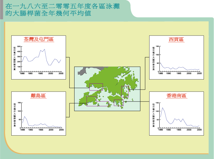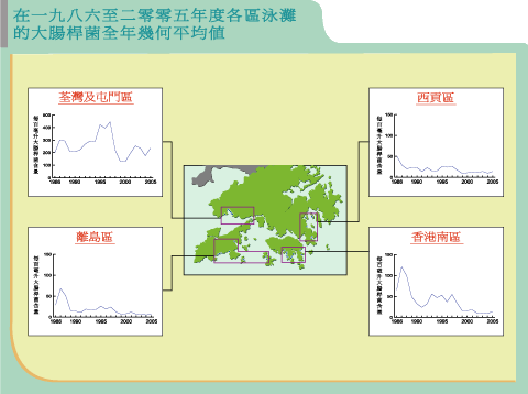 香港目前尚有少數泳灘不符合水質指標。這些泳灘全部位於荃灣區,區內泳灘雖然受到「淨化海港計劃」的排放影響,但未來前景卻相當樂觀,政府為實現重開泳灘的目標,已計劃展開「淨化海港計劃」第二期甲工程,必須依賴各界接受透過收取排污費用來支持此項工程的營運開支,即可望於2009年為昂船洲污水處理廠的排放進行消毒。 以上圖表顯示過去20年來大腸桿菌數量水平(全年幾何平均值)的降低趨勢。在眾多區域中,港島南區的大腸桿菌數量減幅最大,至於早在1990年代初便有良好水質的西貢和離島區泳灘,減幅相對較小。以往南區的泳灘污染嚴重,經過多年來的努力改善,今天終擁有良好的水質環境,環保署深信本港西區泳灘也可在不久將來變得清澈怡人。 總括而言,香港的泳灘環境20年來持續好轉,使泳客受惠。現在市民可選擇到全港各區的泳灘,盡情享受我們美好的海濱勝景。環保署會繼續全力推行泳灘海水抽樣、測試和監察計劃,使每位到香港泳灘消閑的人士可安全和健康地享受碧波暢泳的樂趣。2005年的泳灘數據進一步肯定了本港水質持續改善的趨勢。我們成功地遏止水質惡化,重新改造泳灘環境,使公眾能享用這些寶貴的自然資源。