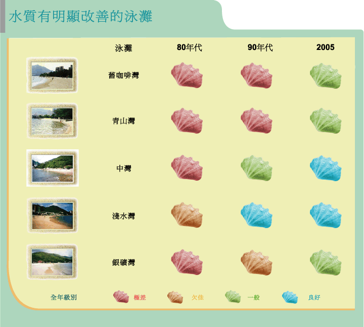 為改善泳灘水質,環保署在過去20年內實施了一連串的環境保護措施,致力減低都市發展和人口增長所構成的環境影響。其中以實施「污水收集整體計劃」成效最為顯著。透過這項措施,我們將公共污水收集網絡擴展至覆蓋全港各區。此外,多項法例在1980年代頒布實施,環保署成為環保法例的主要執法機關。經過多年來嚴厲執行廢物處置和水污染管制條例,再加上居民的配合,使大部份泳灘的水質近年來有大幅的改善。隨 |