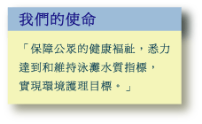 香港的泳灘水質監測計劃是建基於世界認可的嚴謹科學研究成果。此計劃不斷造福香港獨特的自然環境和公眾健康,帶來令人欣慰的改變,對此我們深感自豪。環保署經過多年努力,成功建立了一套有效的監測、維護和行動系統,推行各項措施,大大紓緩了困擾香港多年的水污染問題。回想以往,由於許多泳灘水質欠佳,市民無法享用這些優美的天然資源。而2005年夏季期間,每月均有超過100萬市民到泳灘消閑,顯示了公眾對香港泳灘水質的信心,而環保署所提供的資訊亦發揮其應有的效用。