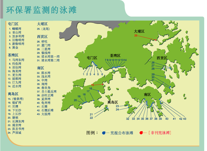 香港有许多海滩,有些与市区仅有咫尺之距,有些则十分偏远,必须乘船或攀山越岭才可到达,但不管远近,每个泳滩均风景迷人令人向往。每年漫长的夏季,碧海银沙的泳滩正是畅泳和消闲的好去处。这些泳滩当中,部份经由政府刊登宪报公布,给予完善的维护和管理,开放予公众使用。宪报公布的泳滩设有更衣室、厕所和冲身设施,开放时更有救生员当值。 |