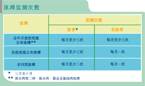 环保署自1986年执行泳滩水质监测工作后,增加了监测的频率。在此之前,宪报公布泳滩在泳季期间每两星期抽取水样本监测一次,非宪报公布泳滩则每月监测一次。本署接管工作以来,多次调整了监测次数,目前每年泳季期间宪报公布泳滩每月最少进行三次水质监测,假如水质突然恶化,监测密度更会相应增加。 整年泳滩水质监测的密度乃视乎季节和个别泳滩的状况而定。本港有多个热门泳滩全年均开放予公众使用,包括清水湾第二湾、深水湾、黄金泳滩及银线湾。环保署全年每月最少在这些泳滩抽取水样本三次进行监测,至于其它宪报公布泳滩大部份只于3月至10月泳季期间开放(个别泳滩每年4月才开放,有些泳滩则于11月才关闭)。每逢泳季,环保署每月最少在各泳滩抽取水样本三次,非泳季则减为每月一次。两个非宪报公布泳滩在泳季内每月抽取水样本两次,非泳季减为每月一次。