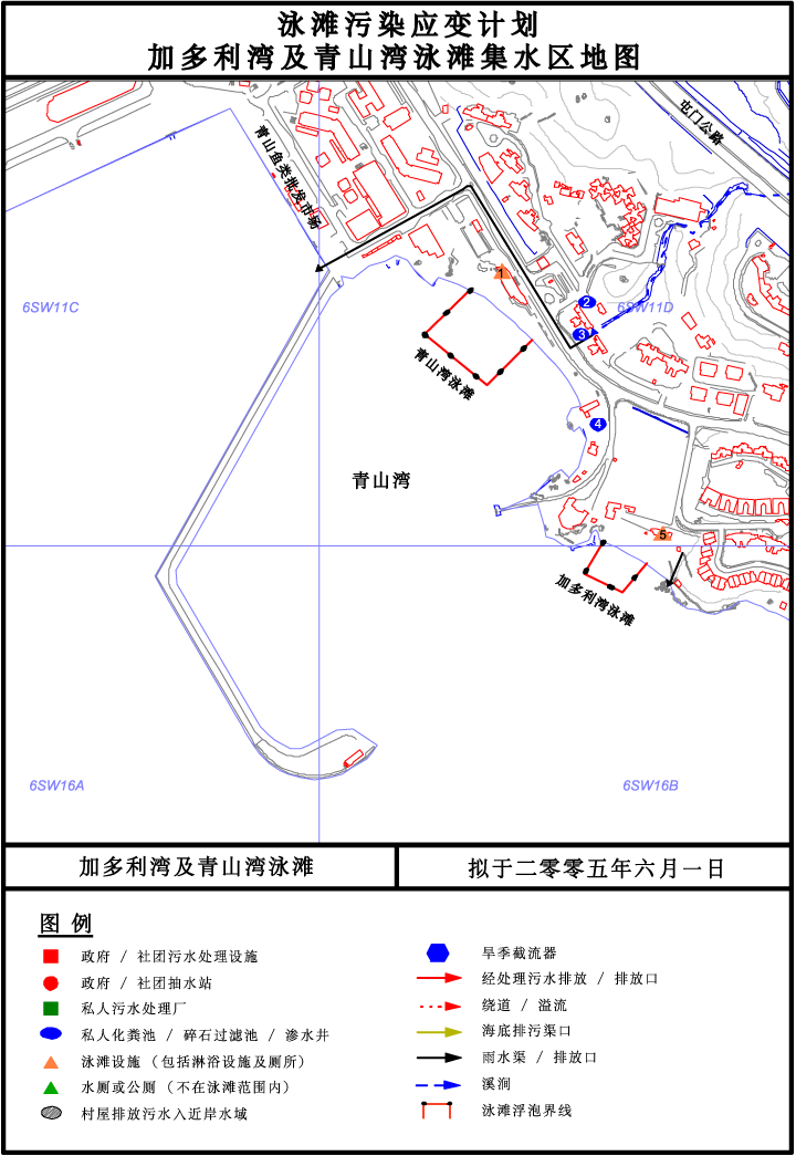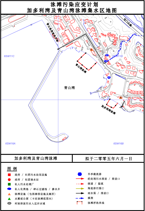 「泳滩污染应变计划」是由一系列有系统的步骤构成,就排放污染物质(意外或蓄意),和污水收集系统及排污口故障或受损等事件所引致的泳滩水质污染而作出的应变。计划订立明确的指引,指定环保署迅速处理类似污染事件的应变程序及列出应采取的措施,亦清晰界定环保署及其它政府部门在处理事件时的权责及沟通程序,以便各方迅速地采取行动。计划并规定如发生严重污染事件,环保署应立即派出人员到现场调查。本计划于1997年开始实施后,整体沟通及应变时间有所改善,污染事件已减至最低,而管控工作亦更加流畅。
