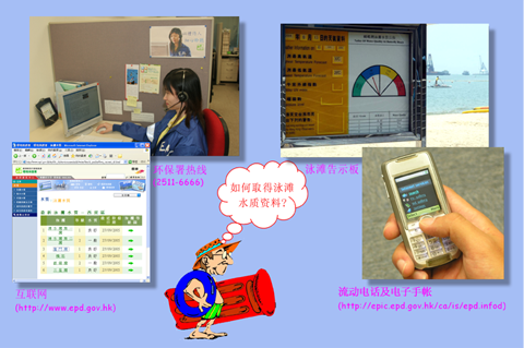 全港各个泳滩已先后设置了泳滩水质等级告示板,泳客抵达泳滩后如欲了解水质状况,只需到告示板查阅便可一目了然。以往由区域市政局管理的泳滩早于1988年便设立了泳滩等级告示板,而市政局辖下的泳滩则待至1999年才备妥设施。同年,环保署亦推出电话泳滩水质查询热线服务,此24小时服务热线至今仍在运作,号码为2511 6666。 1988年,环保署开始公开发表泳滩水质监测计划年报,早年的报告偏重于技术性的资料,较适合作政府内部参考之用,其后年报的内容经过革新,信息更简单易明,渐渐吸引普罗大众阅读,近年我们更制作了既方便又环保的电子版本。 环保署于1998年10月设立泳滩水质网页,次年4月开始每天更新网页资料。时至今日,网页增添了不少信息,1999年开始提供个别泳滩水质趋势,及2000年增设了全港泳滩年度信息。同年,我们首次提供泳滩水质年报的电子文件版本(PDF)供公众下载,2001年则推出光盘版。现时, http://www.epd.gov.hk 网页的资料包罗万有,其中包括最新的泳滩等级和其它关于本署监测各泳滩的有用信息,市民如计划到泳滩消闲,只需用流动电话或电子手帐 (PDA)查询,便可掌握最新的泳滩情报。