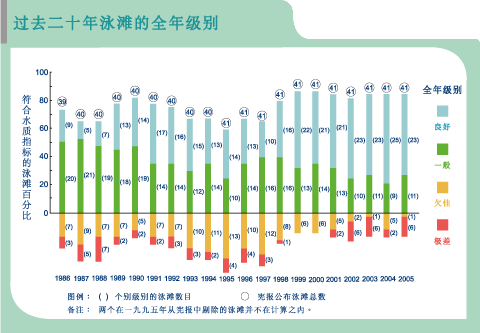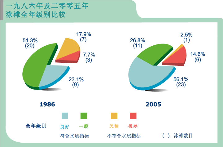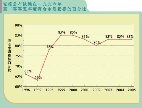 由统计数字可见,环保署过去20年在多方面取得满意成效。继1990年代中期泳滩级别普遍大幅下降后,本港泳滩符合水质指标的百分率录得显著增长,从1986年的74% (39个泳滩中有29个达标)提高至2005年的83% (41个泳滩中有34个达标)。不符合水质指标的泳滩数目明显下降,1987年共有14个泳滩未能达标,但2005年则减少一半至7个。同期,全年级别「良好」的泳滩百分率亦见上升,1986年仅为23%,而2005年则有56%。自1999年至今,泳滩符合水质指标的比率一直维持于80%以上,显示长期以来水质正稳步改善。