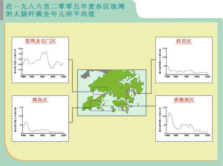 香港目前尚有少数泳滩不符合水质指标。这些泳滩全部位于荃湾区,区内泳滩虽然受到「净化海港计划」的排放影响,但未来前景却相当乐观,政府为实现重开泳滩的目标,已计划展开「净化海港计划」第二期甲工程,必须依頼各界接受透过收取排污费用来支持此项工程的营运开支,即可望于2009年为昂船洲污水处理厂的排放进行消毒。 以上图表显示过去20年来大肠杆菌数量水平(全年几何平均值)的降低趋势。在众多区域中,港岛南区的大肠杆菌数量减幅最大,至于早在1990年代初便有良好水质的西贡和离岛区泳滩,减幅相对较小。以往南区的泳滩污染严重,经过多年来的努力改善,今天终拥有良好的水质环境,环保署深信本港西区泳滩也可在不久将来变得清澈怡人。 总括而言,香港的泳滩环境20年来持续好转,使泳客受惠。现在市民可选择到全港各区的泳滩,尽情享受我们美好的海滨胜景。环保署会继续全力推行泳滩海水抽样、测试和监察计划,使每位到香港泳滩消闲的人士可安全和健康地享受碧波畅泳的乐趣。2005年的泳滩数据进一步肯定了本港水质持续改善的趋势。我们成功地遏止水质恶化,重新改造泳滩环境,使公众能享用这些宝贵的自然资源。