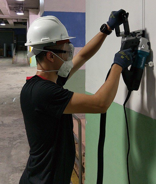 砖墙开槽机可被用在内墙上开凿沟槽,以安装电气插座丶电气喉管和水喉等。实验结果显示,相比起使用传统手提撞击式破碎机,使用砖墙开槽机可以有效地减少制造大约19dB(A)的结构性噪音。要是用於清除墙身表面水泥时,砖墙开槽机亦可和破碎机交替使用,大幅减少使用破碎机的时间。