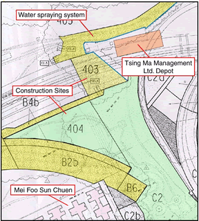 The construction sites were situated near Mei Foo Sun Chuen and there was a common main haul road of about 400 m long leading from the Container Port Road. Although the road was paved with concrete, dust arising from mud dropped off from the trucks when they drove passing this road was the main environment concern effecting the staff accommodated at the adjacent depot. |