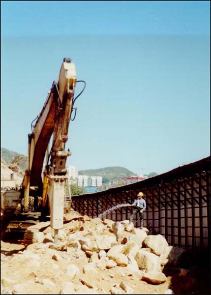 管理 ── 裝設自動灑水系統抑塵,整個爆破工程施工範圍以不透孔罩布完全圍封。