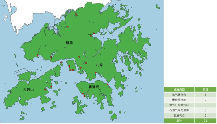 政府对危险装置订有特殊的管制规定。任何工业装置,如使用的危险物料超出指定数量上限,便会受到管制。这类「具有潜在危险的装置」包括石油气库与油库、住宅屋邨石油气库、煤气厂、爆炸品仓库及滤水厂氯气储存仓。
