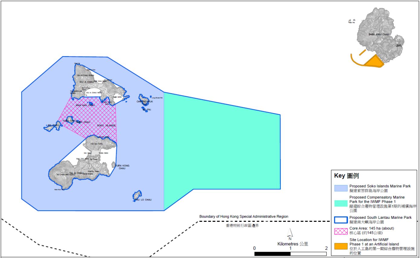 在拟建的补偿性海岸公园附近,有一个由渔农自然护理署倡议,面积约为1,270公顷的索罟群岛海岸公园,目的是保护中华白海豚和江豚的重要栖息地。该处水域是中华白海豚和江豚都会恒常出没的独特地方。