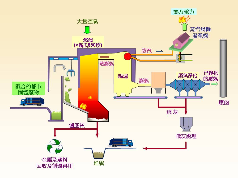 为了保障公众健康和符合规管组织订定的严格气体排放标准(例如欧盟的废弃物焚化指令),现代化的废物焚化能源回收设施都会采用先进的设计及程序控制措施,如以下流程图中所示: