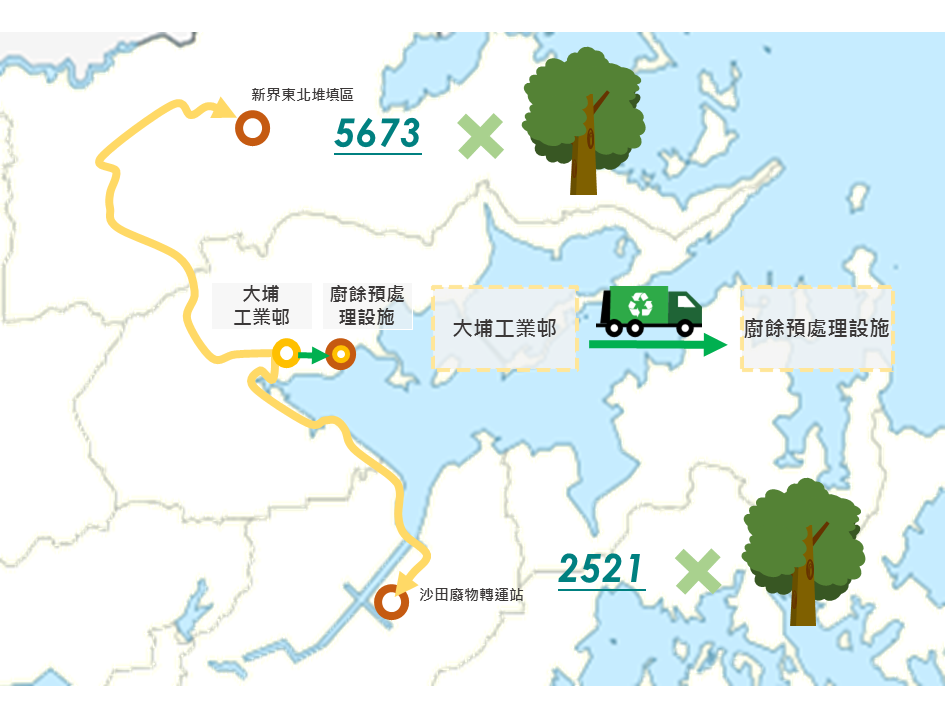 以每日运送50公吨厨余到厨余预处理设施为例,垃圾车每日的车程可减少360公里(弃置到新界东北堆填区)或160公里(弃置到沙田废物转运站)。缩短厨余运送车程有助于减少垃圾车的燃料使用,从而减低温室气体的排放。据我们的初步估计,所减少的温室气体排放量等于每年额外种植2521至5673棵的树木*。