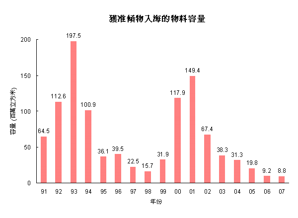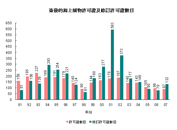 2007年 根据《海上倾倒物料条例》采取的执法行动及统计数字 根据《海上倾倒物料条例》规定,政府可透过签发许可证,管制任何人士在海上倾卸(详见「废物」章节的立法部分)。现时,当局接纳市民将疏浚海泥倾倒入海。如未申领许可证而将废物倾倒入海或违反许可证条文,初次违例者一经定罪,最高罚款港币20万元及入狱六个月;第二次或其后违例而被定罪者,最高可罚款港币50万元及入狱两年。2007年,并无检控。 图片数据 图片数据