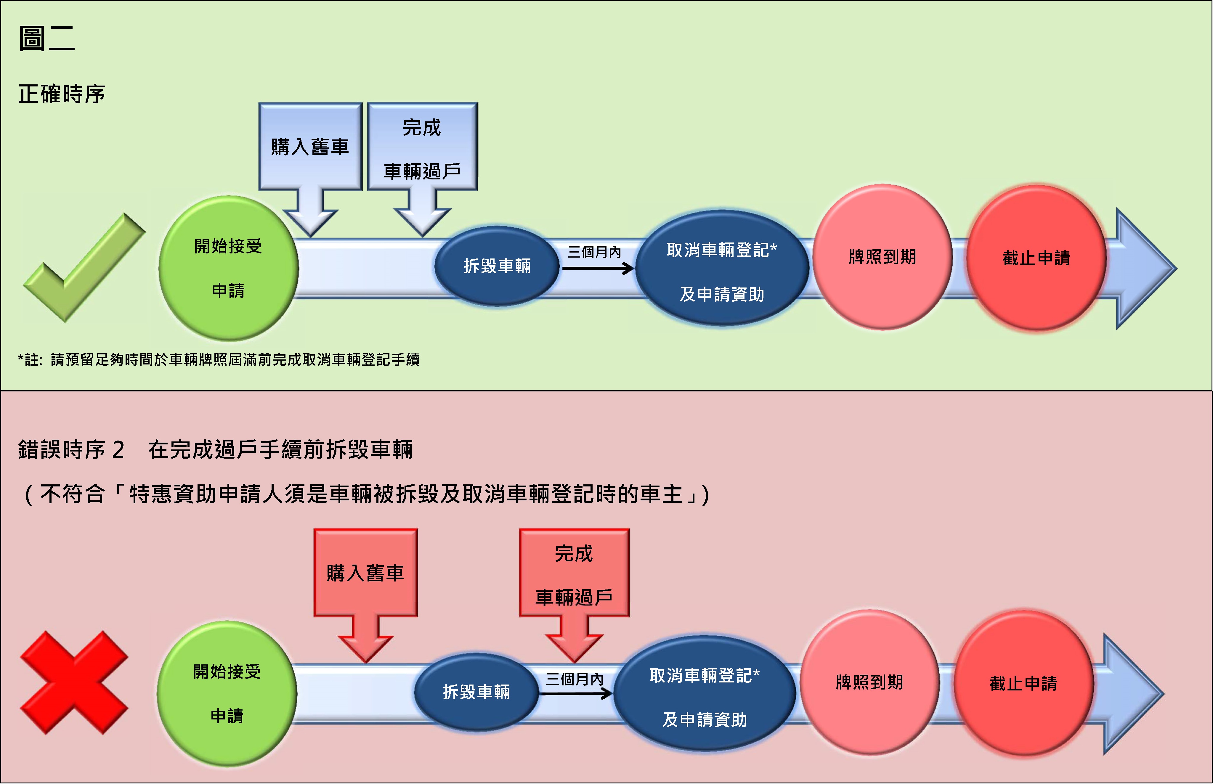 | 新車主購入車輛後,未在運輸署完成車輛過戶已將車輛拆毀。(見圖二). | 不符合「申請資格」第6項「特惠資助的申請人須是車輛被拆毀及取消車輛登記時的登記車主」。 | 新車主應先就其新購入車輛向運輸署提交申請車輛過戶,待運輸署發出書面批准後,車主才安排交由登記拆車商拆毁車輛。 |