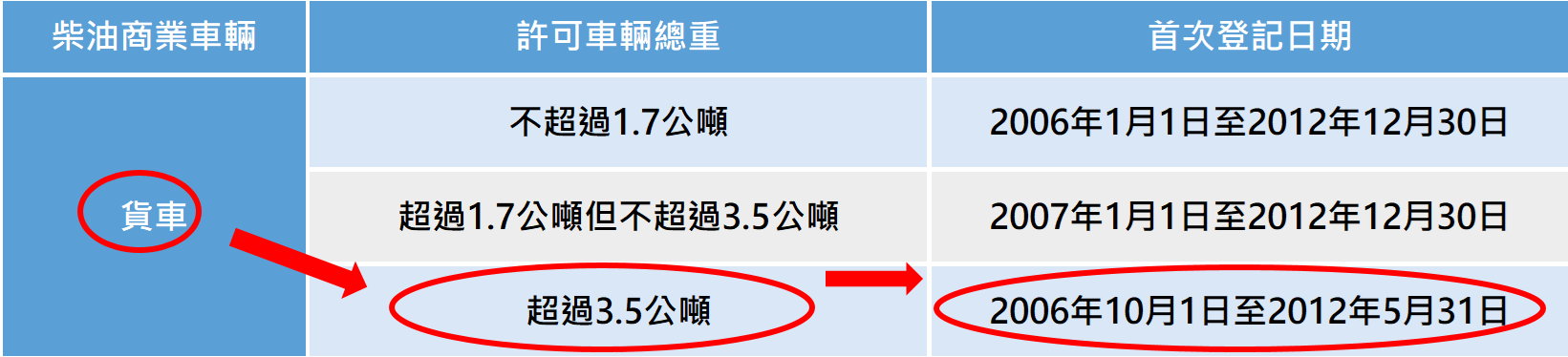 摘錄自表二 特惠資助計劃下歐盟四期柴油商業車輛取消車輛登記期限