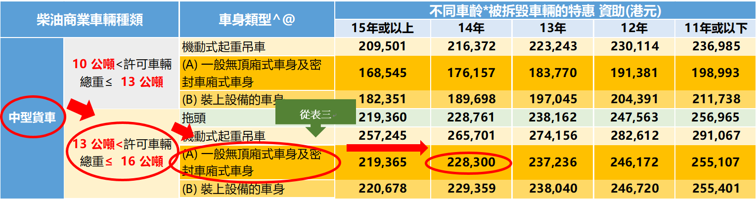 問2:特惠資助金額是多少? 答2:如該被拆毀的車輛是在2021年9月6日被取消車輛登記,該車輛當天的車齡是14年10個月(因此計算為14年)。特惠資助金額為港幣228,300元。下圖說明如何從表三及表四中找到這些資料。