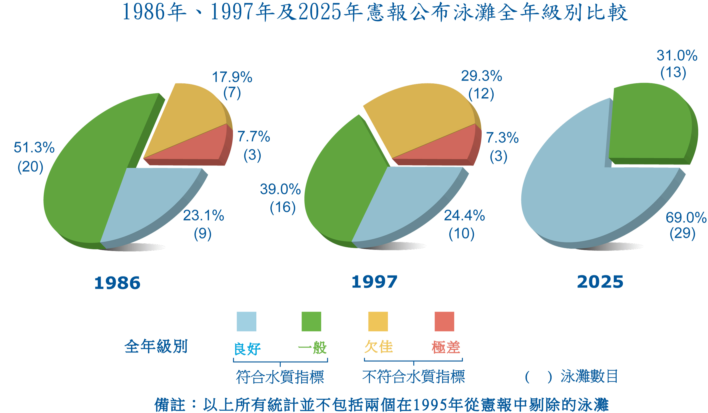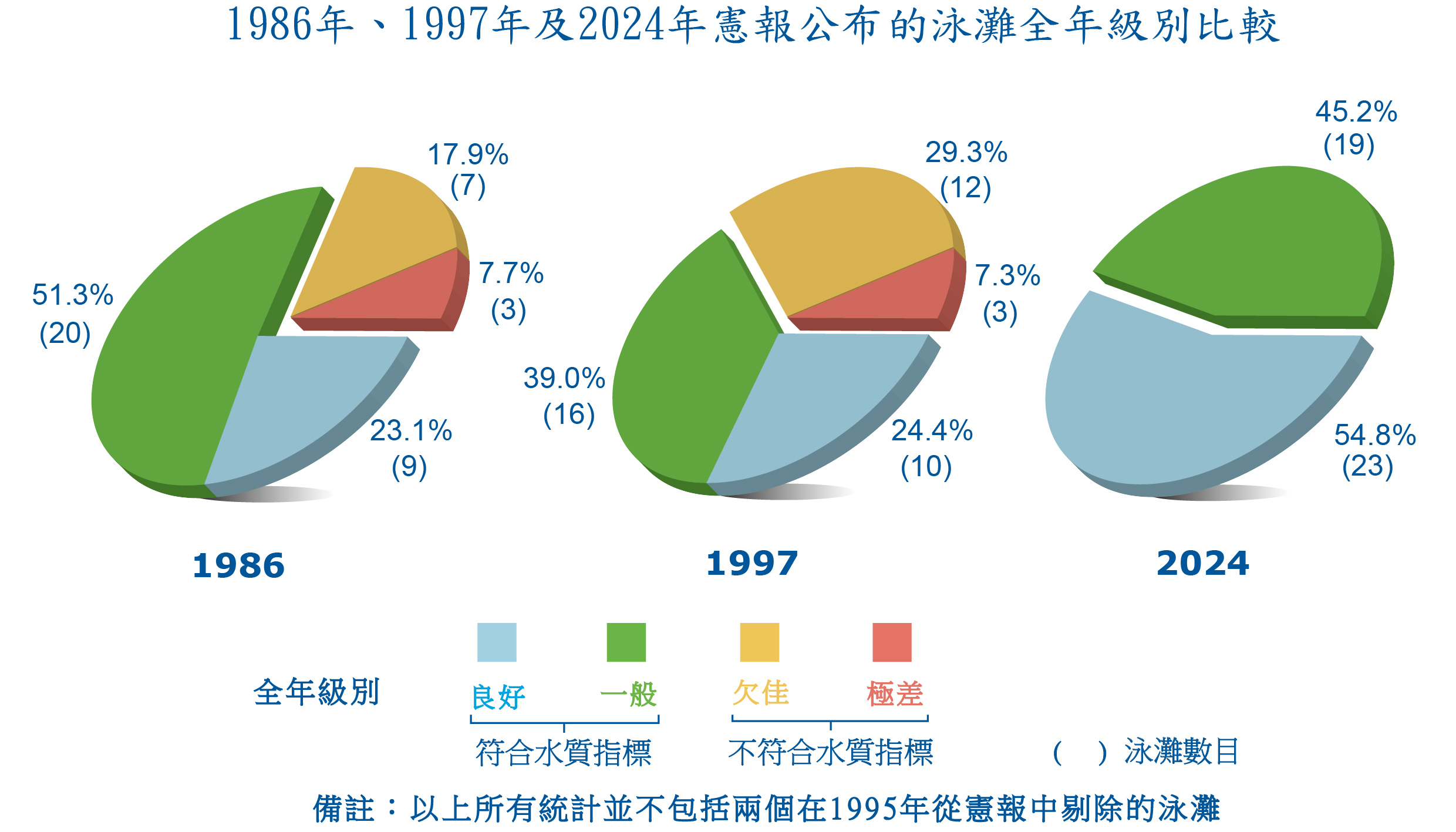 香港泳灘水質整體改善情況 儘管人口急速增長和經濟迅速發展帶來污染,但在過去整體泳灘水質有所改善。 水質指標達標率由 1986 年的 74% 變為 2010 年以來的 100%。 泳灘水質監測計劃記錄水質變化和找出需要改善的問題泳灘,以便改善泳灘水質,和保障每年數百萬游泳人士的健康。 了解更多 銀礦灣泳灘 淺水灣泳灘 青山灣泳灘 南區泳灘