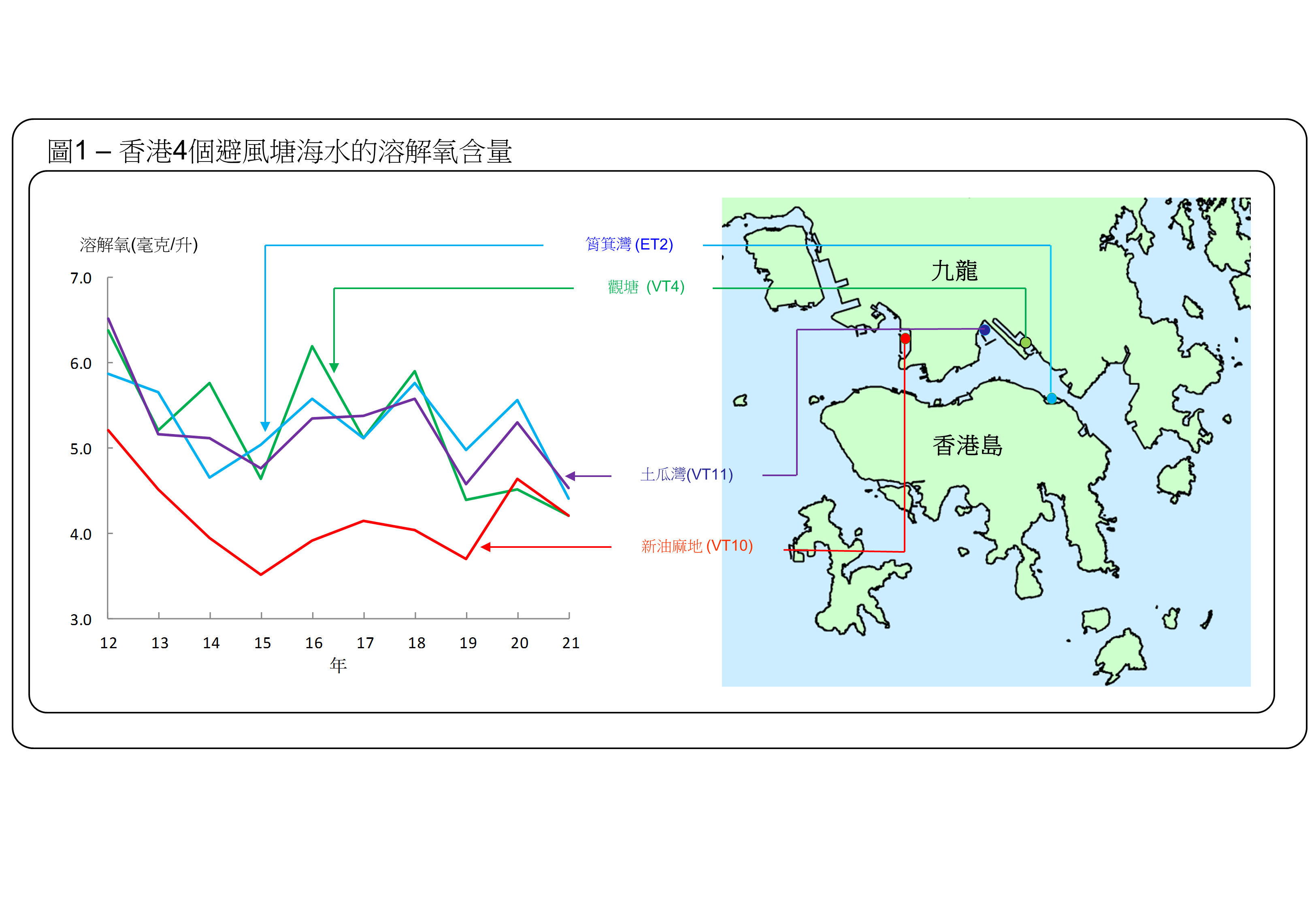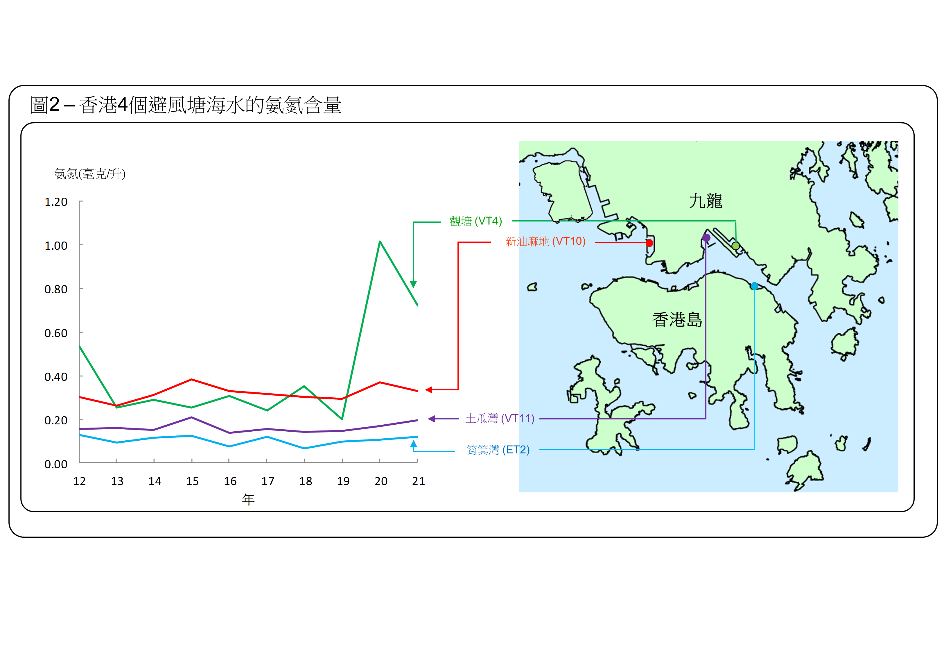 避風塘水質 環境保護署(環保署)定期測量多項水質參數,以評估本港各避風塘的污染情況。圖1顯示香港四個避風塘的溶解氧含量。避風塘內的氨氮含量請參閱圖2。另外,《香港海水水質》年報亦刊載了各避風塘的其他水質資料。 圖片數據 圖片數據