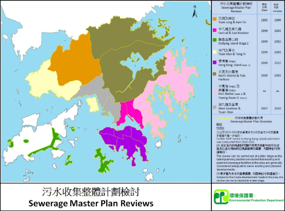 沒有表頭 沒有表頭 污水收集整體計劃 「污水收集整體計劃」是污水收集基礎設施的藍本,它的目標是收集全港每個污水收集區的污水,然後引流到污水處理廠進行處理。目前全港已劃分為16個污水收集區,每區均制訂一套「污水收集整體計劃」。為配合香港現時及未來發展的需要,當局已陸續落實各區「污水收集整體計劃」中建議的工程。此外,為配合本港新修訂的人口預測和有關的發展項目建議,這些「污水收集整體計劃」已進行檢討。 污水收集整體計劃檢討