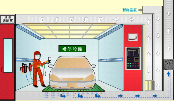 噴塗工序應在焗油房或工場內的特定工作間進行。焗油房及特定工作間應設有空氣污染控制設備,包括過濾油漆粒子設備,並應經常維修保養