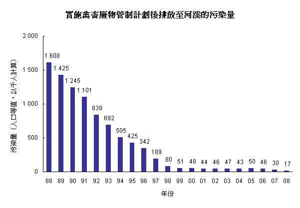 自從2005年及2006年兩個自願選擇退還牌照計劃推出後,禽畜農場的數目已進一步減少了79%,而禽畜廢物產生的數量相應地減低了46%。活家禽業界特惠補助金計劃於2008年第三季推出,預期禽畜農場及禽畜廢物的數量會進一步減少。